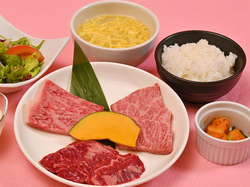 上ロース50g、上カルビ50g、ハラミ50g、ライス、スープ、本日のキムチ、一品、サラダ